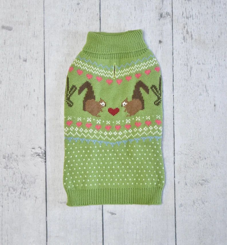 This Woodland inspired knit featuring playful squirrel motifs, tiny hearts and vintage isle charm. rafted in a fern color perfect for tree-chasers, trail-trotters and backyard daydreamers alike