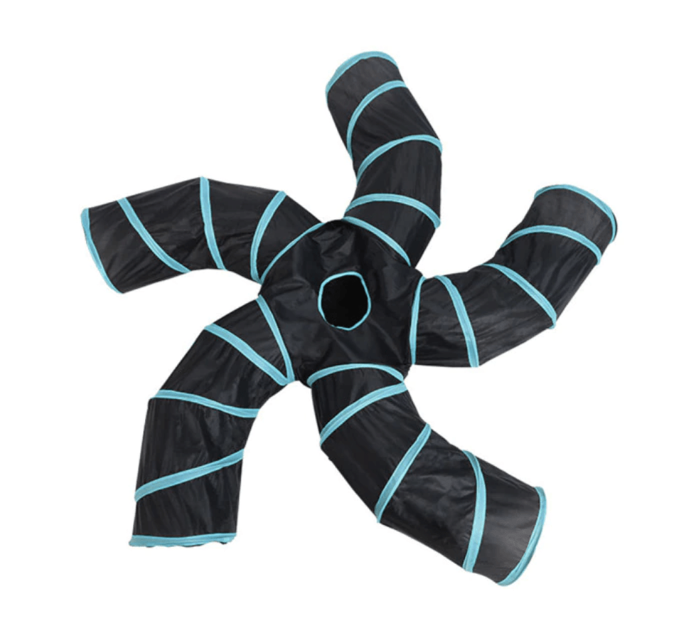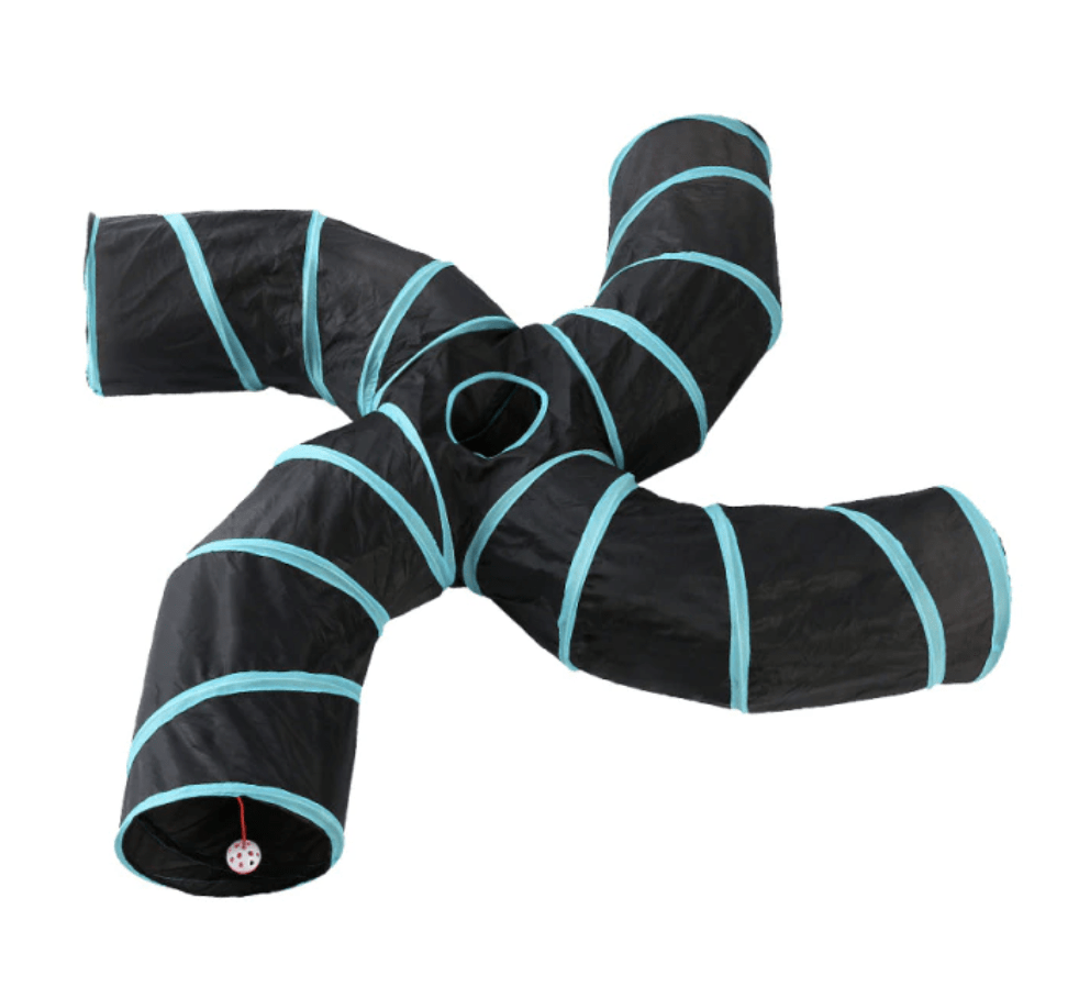 This tunnel features a sleek black design with pink accents – no obnoxious loud prints. It’s made of durable 190T polyester that resists snagging and tears, even from sharp kitty claws. The rugged steel frame helps maintain the tunnel’s shape over time, with covered ends to keep your cat safe from pokes. The Three-Way Exercise Tunnel Cat Toy collapses into a compact size, so it’s easy to take the fun with you anywhere – whether you’re dropping Fluffy off at the sitters or traveling cross-country.